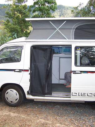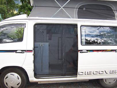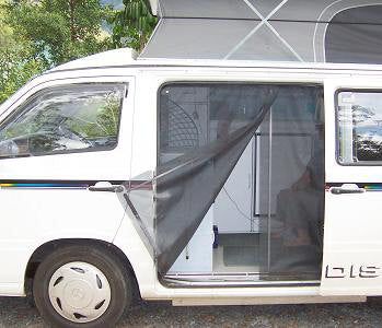 Option 2: The Flexible Magnetic Tailgate Insect Screen is comprised of three overlapping mesh panels that are held in an internally fitted track at the top of the rear opening. A two part flexible magnetic fastener seals the centre panel against the two outer panels for the full depth of the opening. The vertical perimeter seals are provided by a track system. When insects are not an issue the centre panel can be rolled up and tied at the top of the door opening.