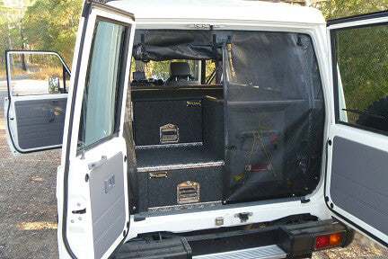 The Flexible Magnetic Insect Screen for the rear opening provides an effective insect screening barrier to the entire rear opening of the Toyota Troop Carrier. The Flexible Magnetic Insect Screen for the rear opening is comprised of mating mesh panels secured internally at the head of the rear opening in a track. The vertical perimeter seal down both sides of the opening is also provided by a track system. The seal between the mating mesh panels is provided by full length rare earth magnet. The bottom seal is also provided by a magnetic means of attachment.